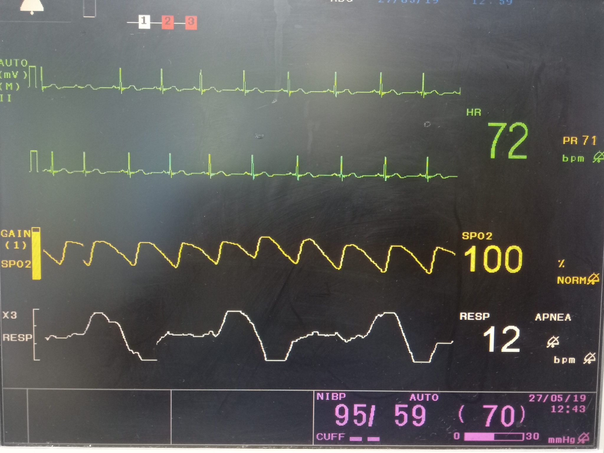 Several ways to measure respiration. Measured either through capnography or ECG. Capnography nor respiration measured from ECG. Priority to capnography when the patient under inductional agents then respiration